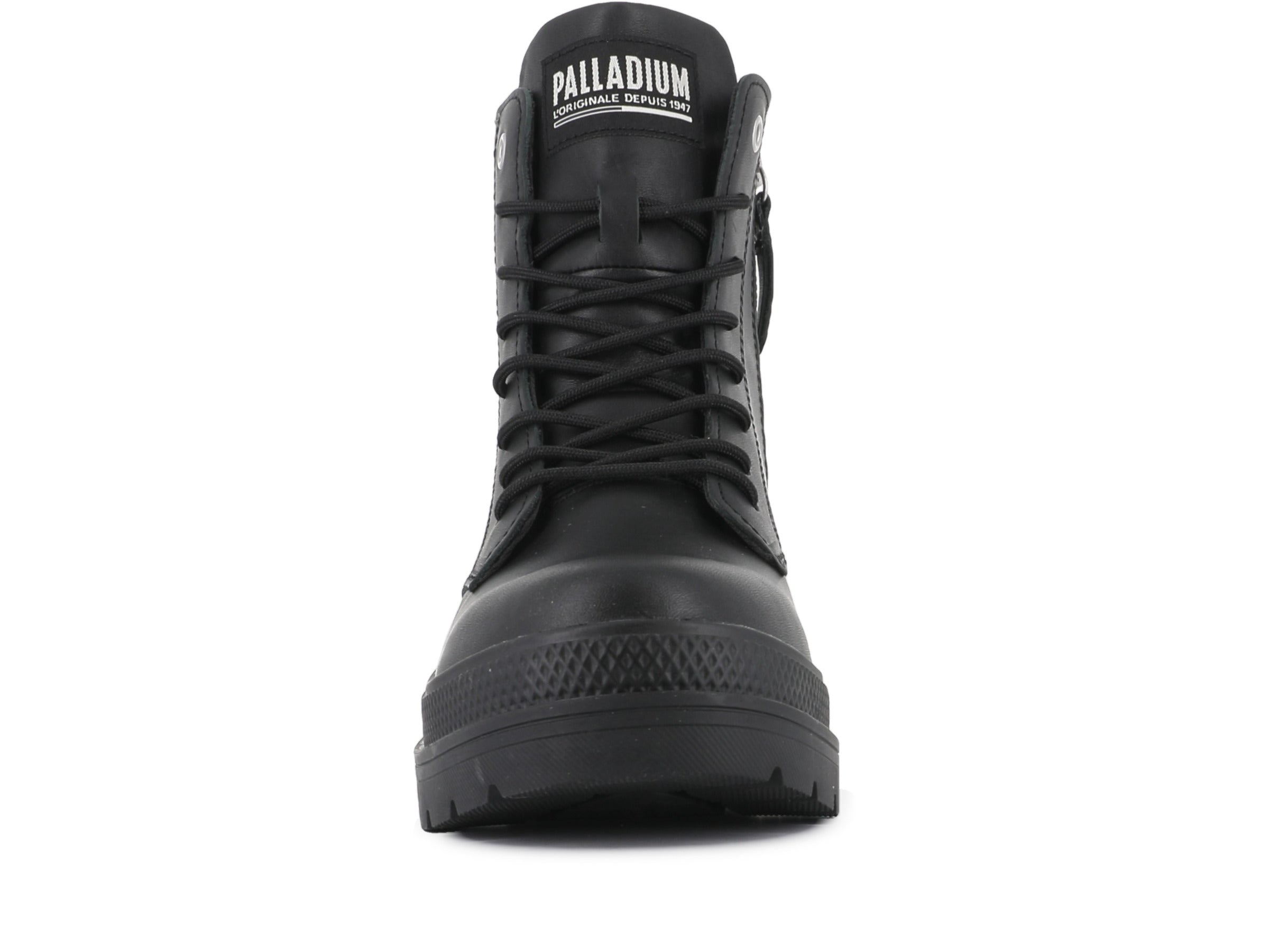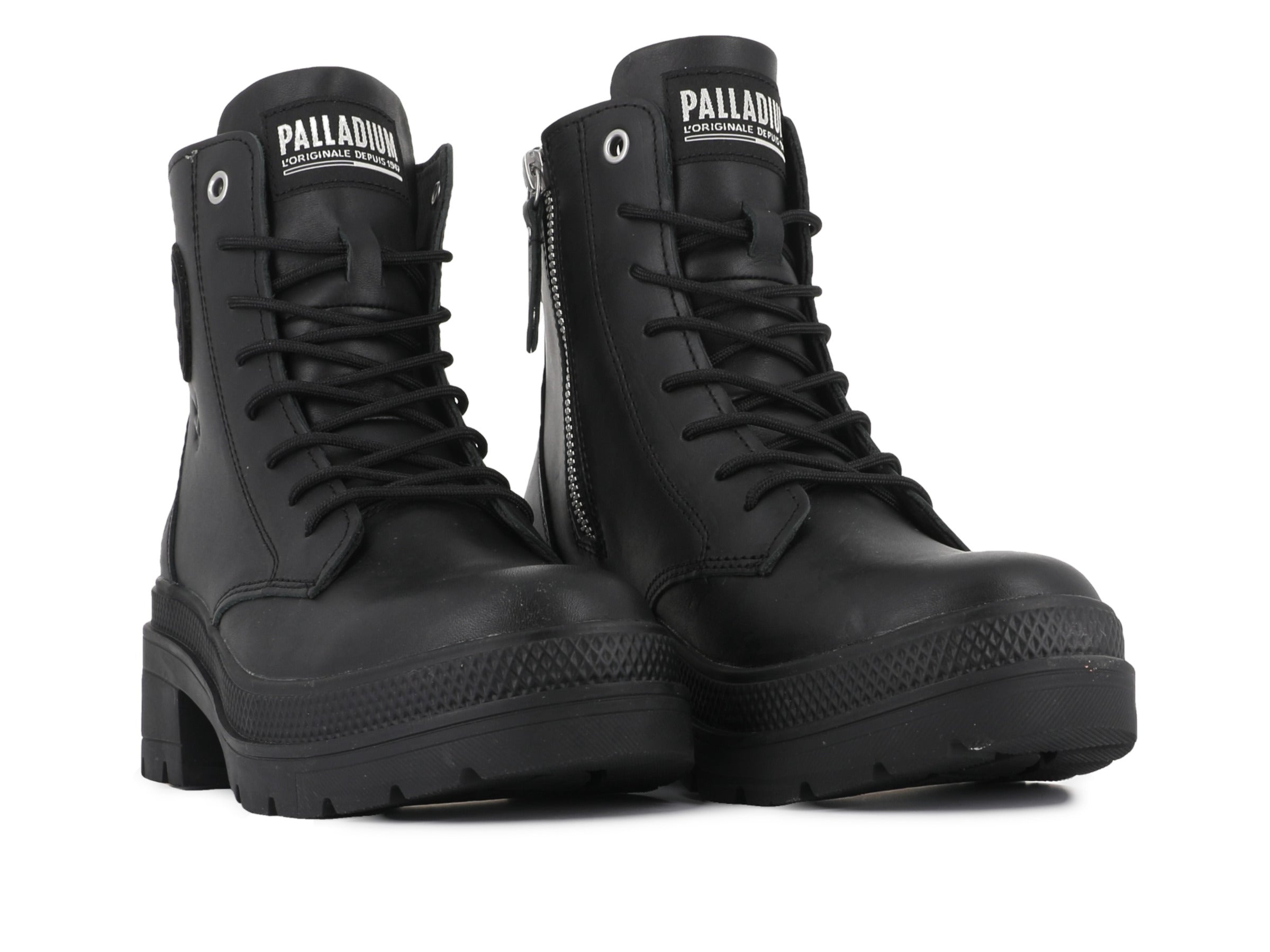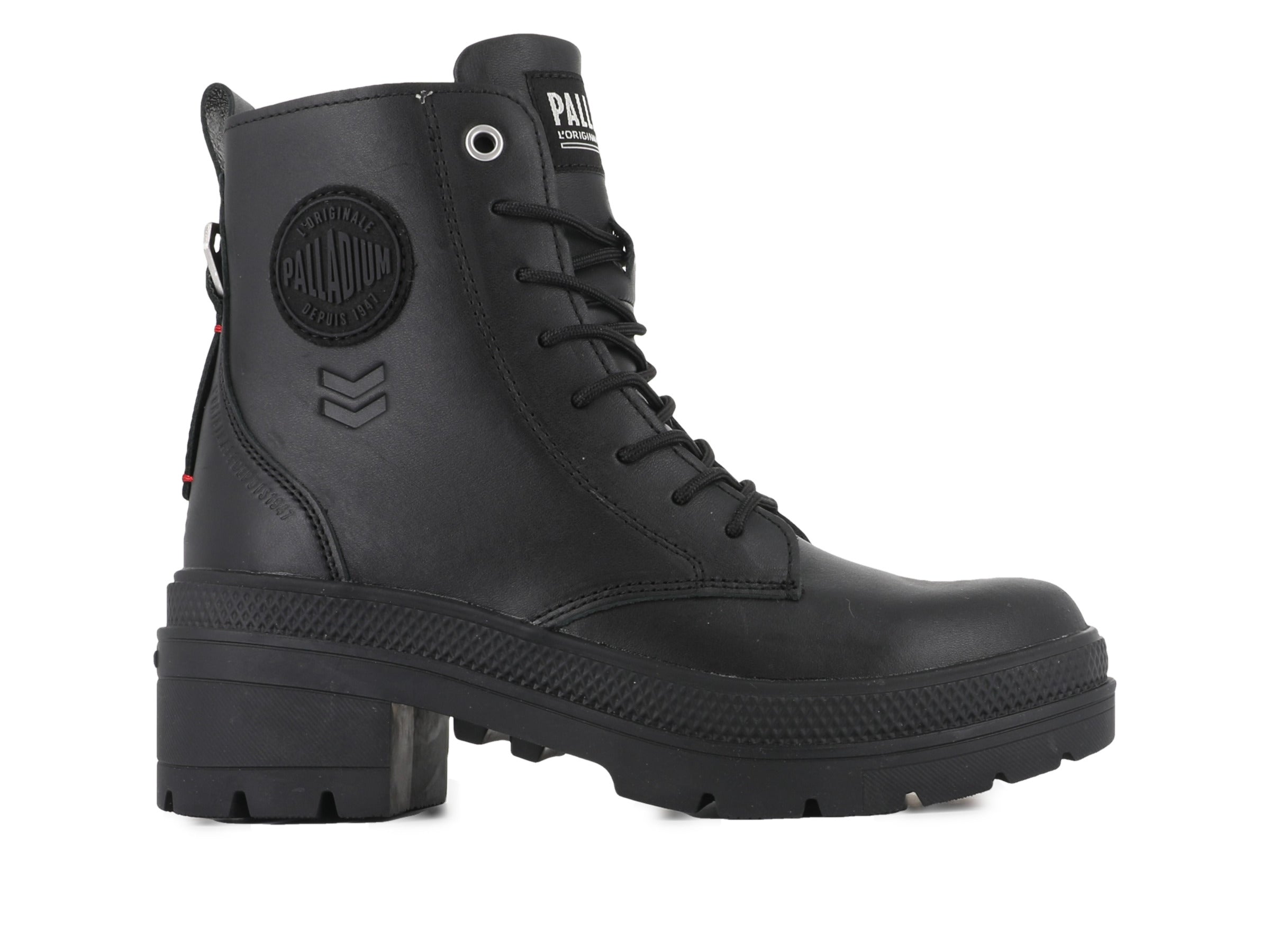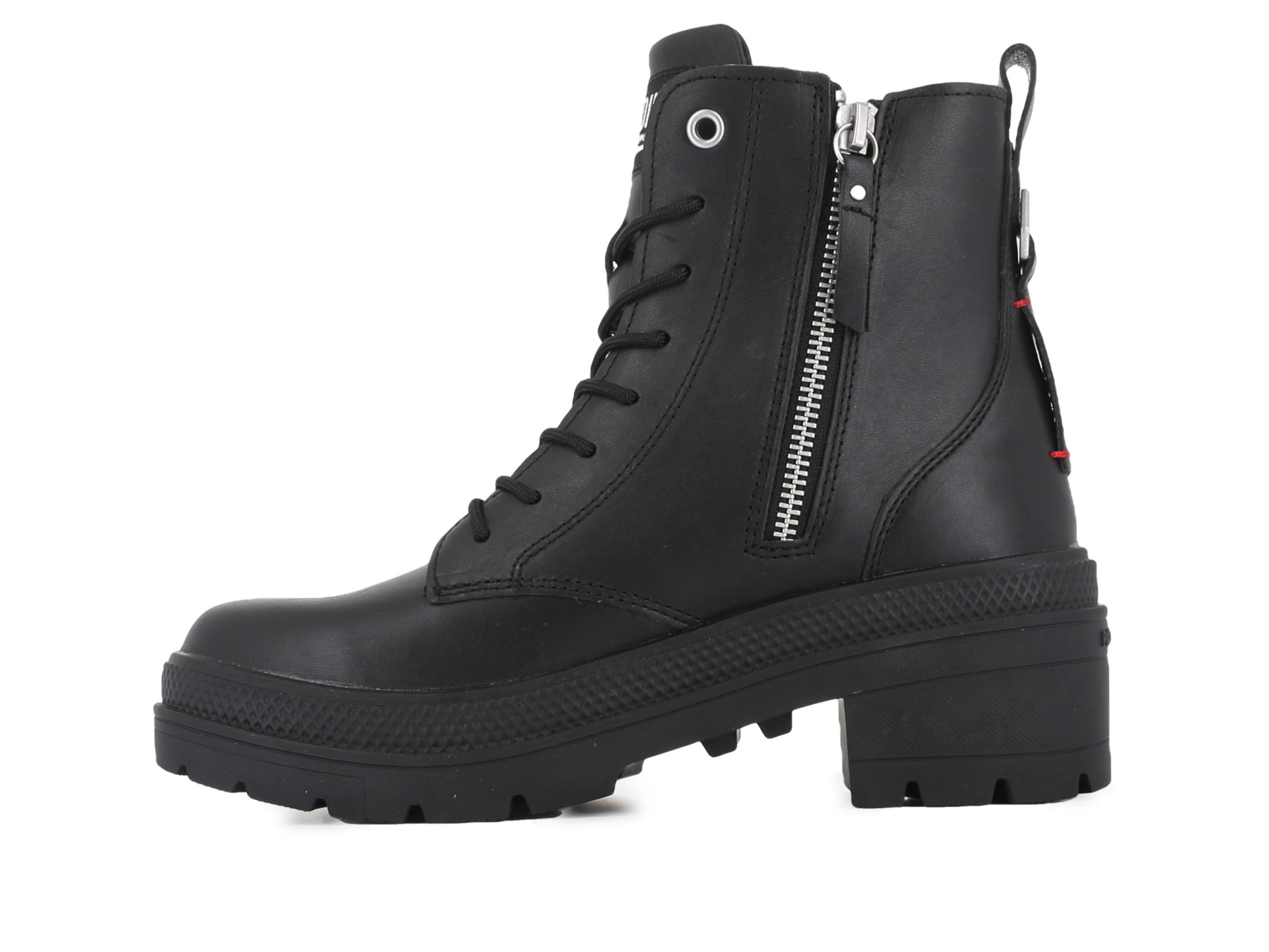 A sleek women’s leather boot blending urban style with feminine edge. Crafted from soft nappa leather, it features a clean upper, elevated heel, and inner zip for easy wear. Military-inspired details and bold branding highlight Palladium’s French design heritage. Perfect for city streets and everyday statement style.